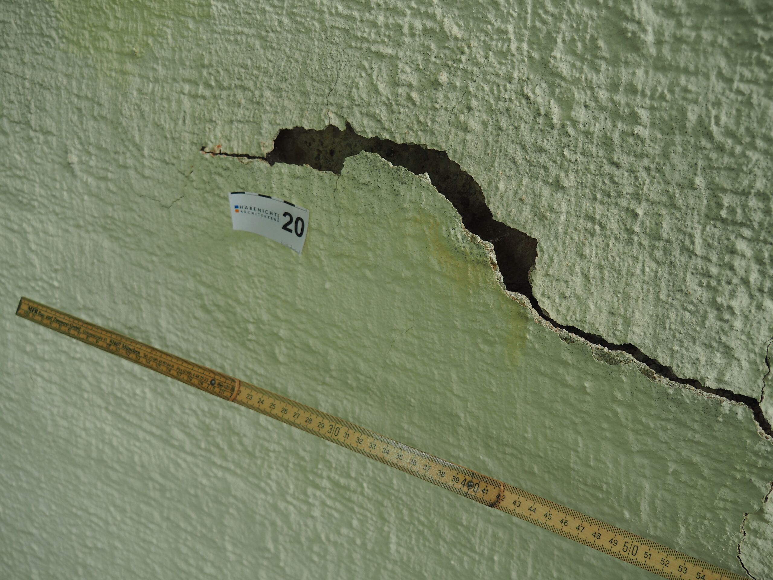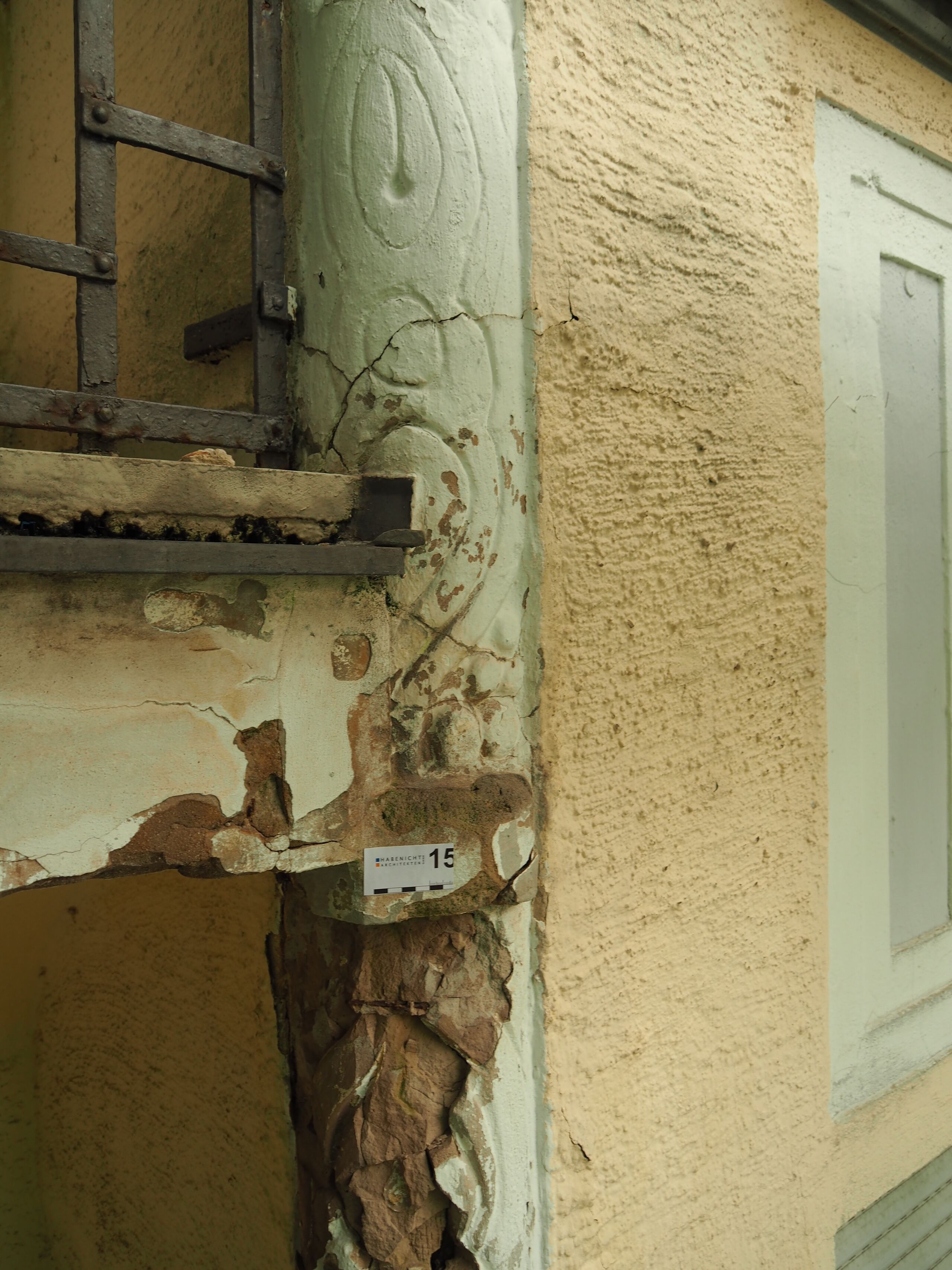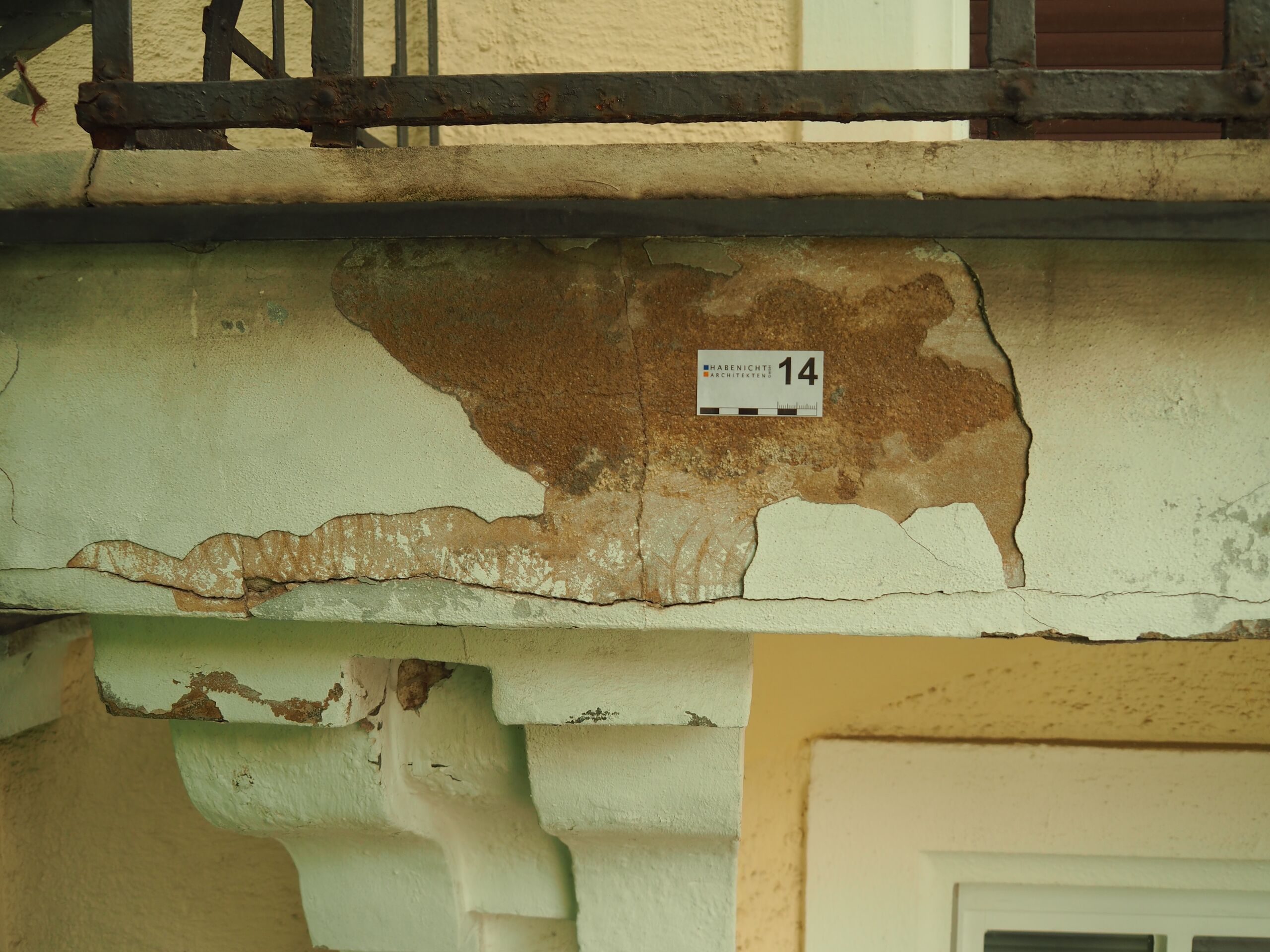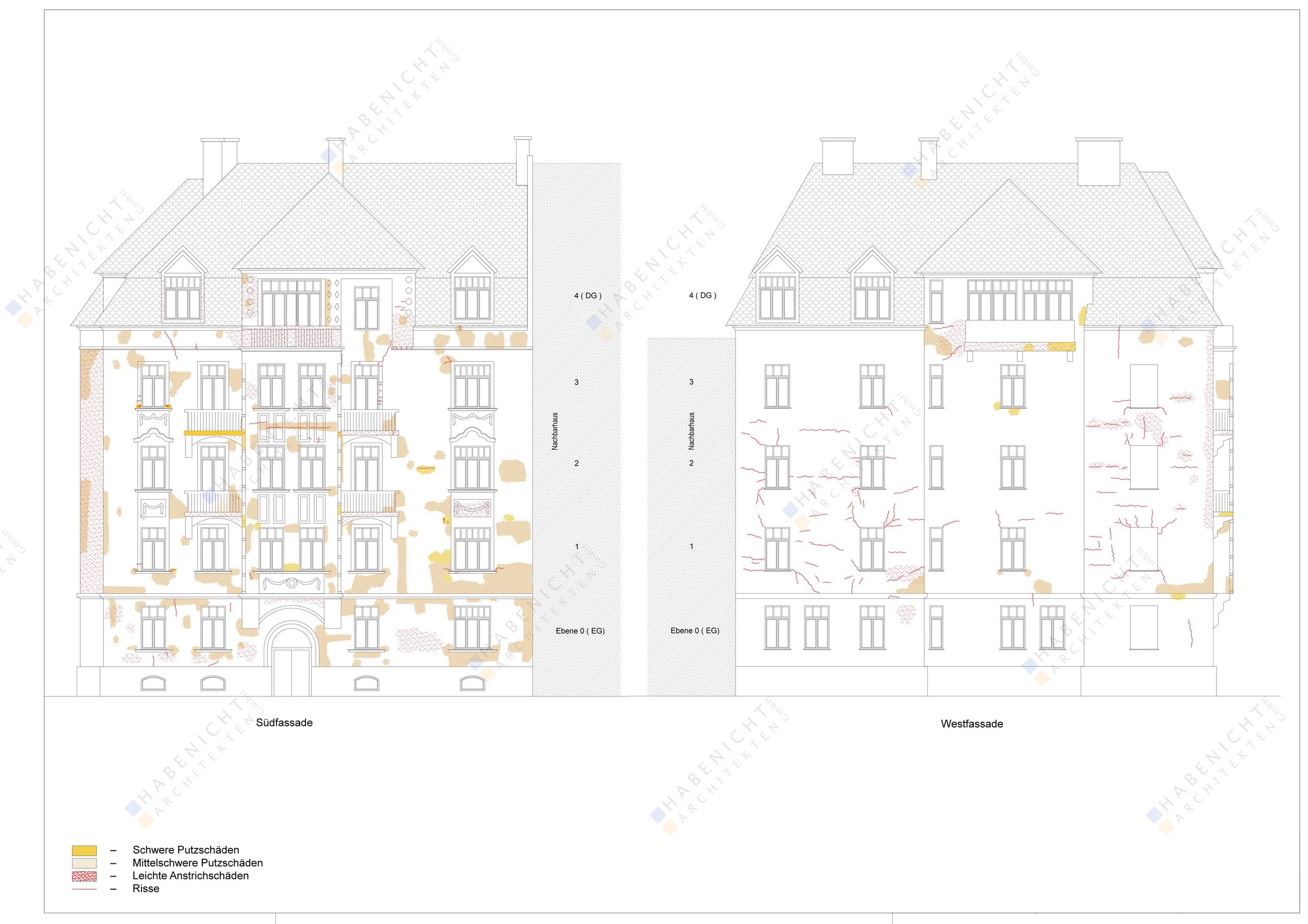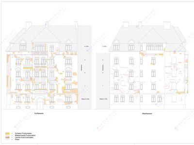 Im Zuge der Bestandsaufnahme bzw. Schadenskartierung wurde festgestellt, dass sich die Fassaden insgesamt in einem stark sanierungsbedürftigen Zustand befinden. Es zeigen sich zahlreiche Risse im Putz, Hohlstellen sowie bereits abgeplatzte Bereiche. Besonders betroffen ist die südwestliche Straßenfassade, an der neben flächigen Putzschäden auch erhebliche Beeinträchtigungen der Zierprofile, Gesimse und ornamentalen Fassadenelemente vorliegen.